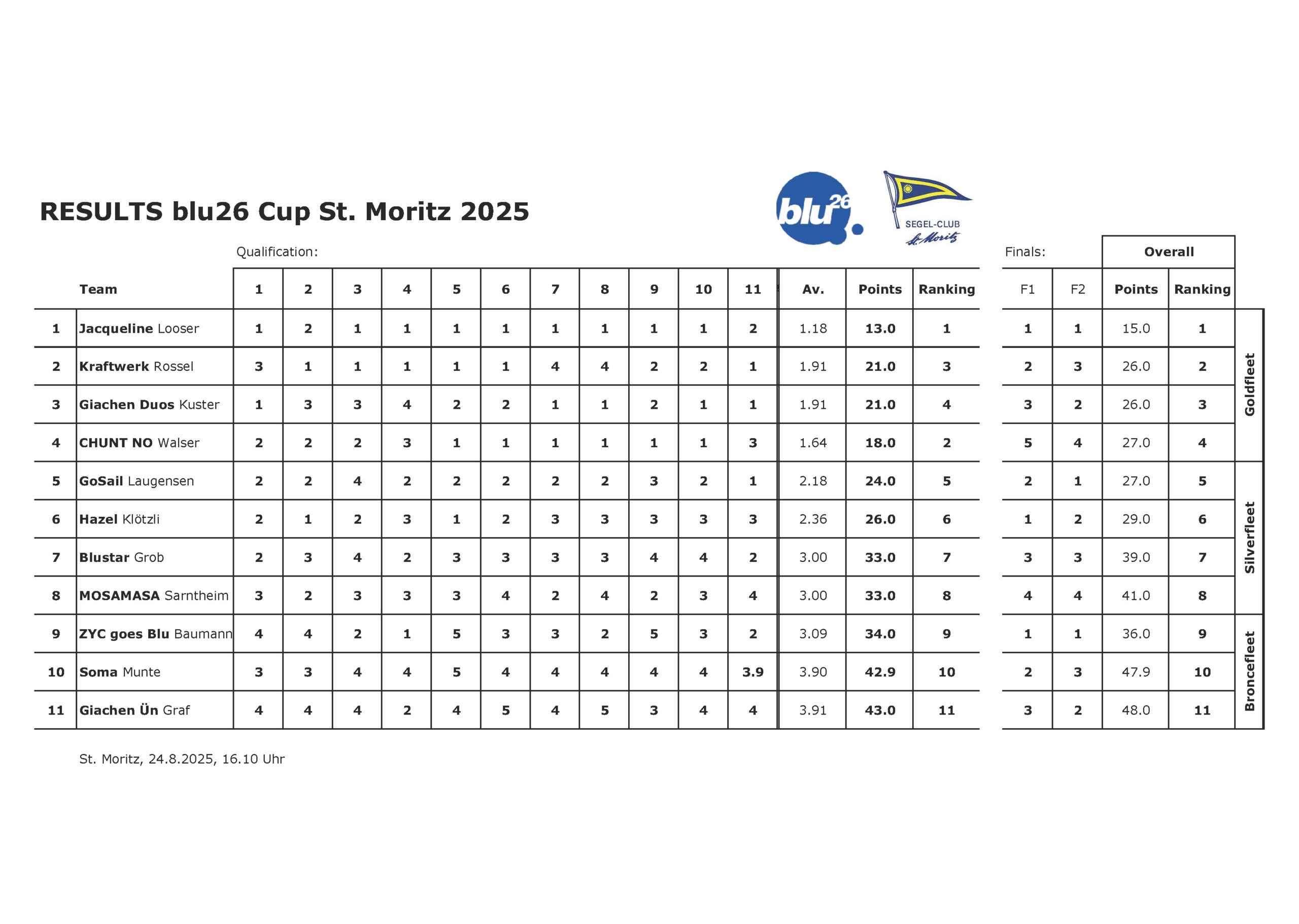 Am Final-Sonntag regnete es erst einmal und der Wind liess erstmal auf sich warten. Gegen mittag wurde es trocken und die beiden Wettfahrtleiter Felix Somm und Stephan Hawranke nutzten den leichten Südwind aus, um nochmals 2 Finalläufe zu starten. Skipper Marcel Walser mit seinem Team Mastebeto gewann auch das grosse Finale und somit den blu26 St. Moritz Cup. Bei den nächsten beiden Rängen zeigte die Jugend ihr Können: das junge Team um Anna Nyfeler konnte sich auf dem zweiten Rang vor dem Team Giachen 2 mit dem Skipper Luca Höfer platzieren. Im kleinen Finale um die Plätze 7 – 13 konnte das junge Team um Fabrice Kohler (16) Ihre erste blu26 Regatta gewinnen und wurden damit hervorragende Siebte.